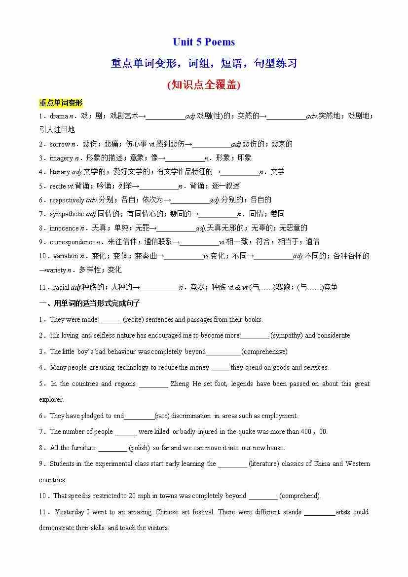 Unit 5 Poems单词变形,词组,短语,句型练习-(人教版)