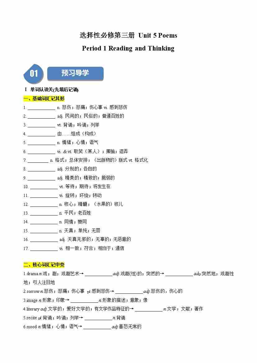 Unit 5 Poems:Period 1 Reading and Thinking(学案)(学生版)-(人教版选择性必修第三册)