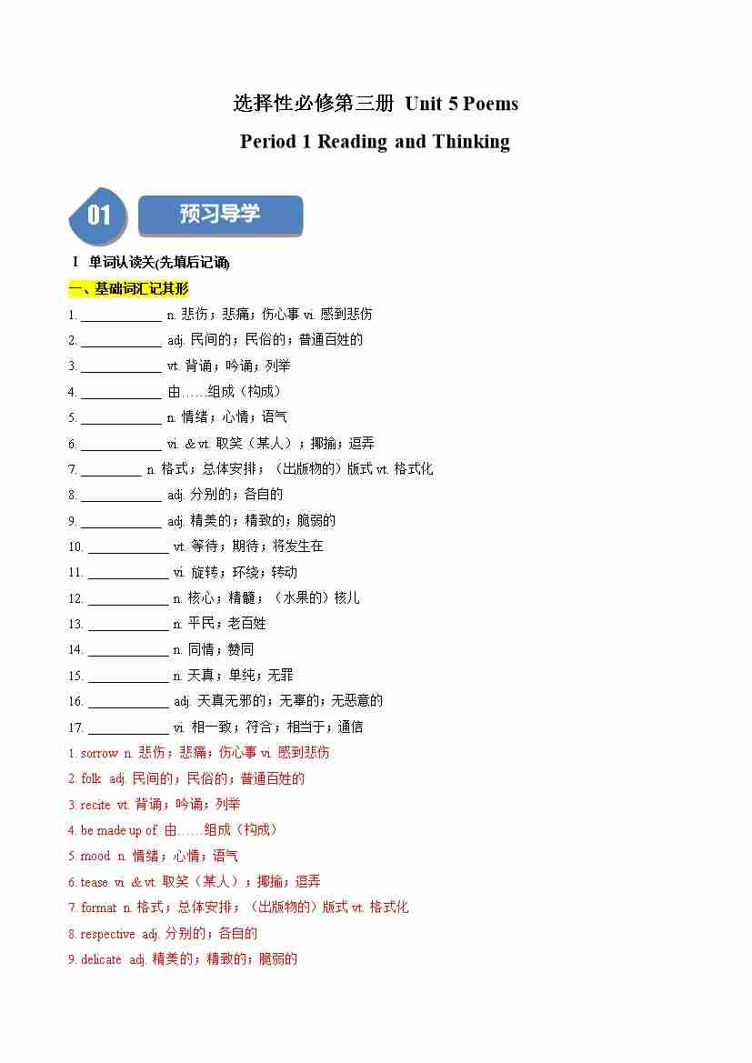 Unit 5 Poems:Period 1 Reading and Thinking(学案)(教师版)-(人教版选择性必修第三册)