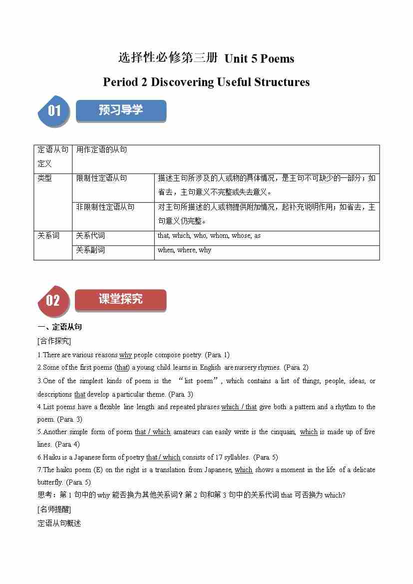 Unit 5 Poems:Period 2 Discovering Useful Structures-(学案)(教师版)-(人教版选择性必修第三册)