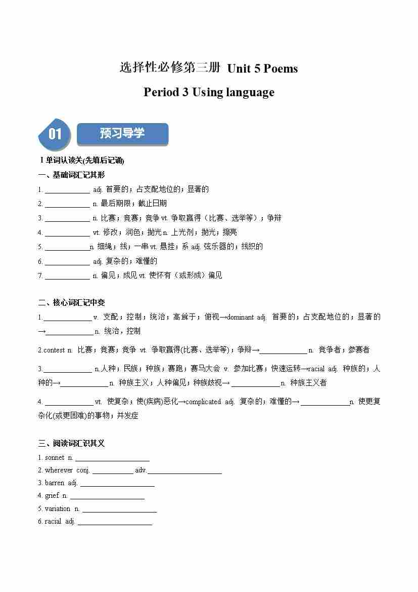 Unit 5 Poems:Period 3 Using language(学案)(学生版)-(人教版选择性必修第三册)