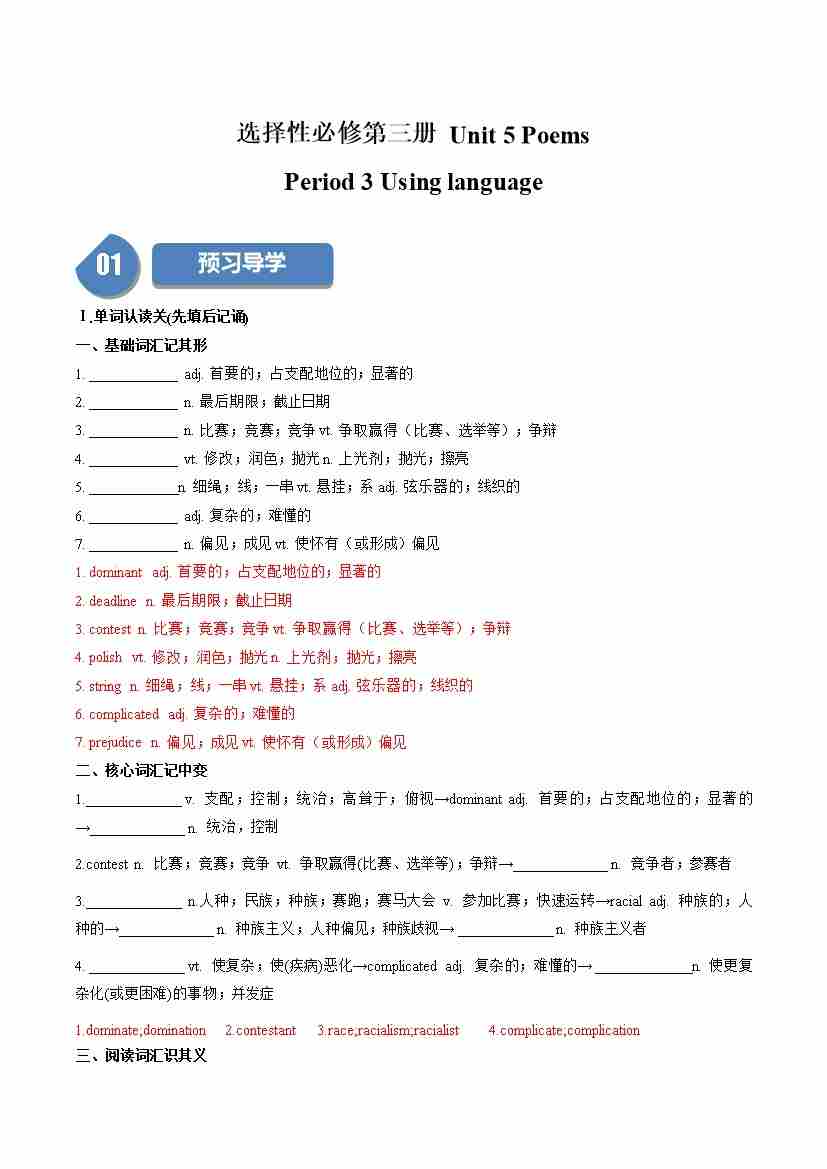 Unit 5 Poems:Period 3 Using language(学案)(教师版)-(人教版选择性必修第三册)