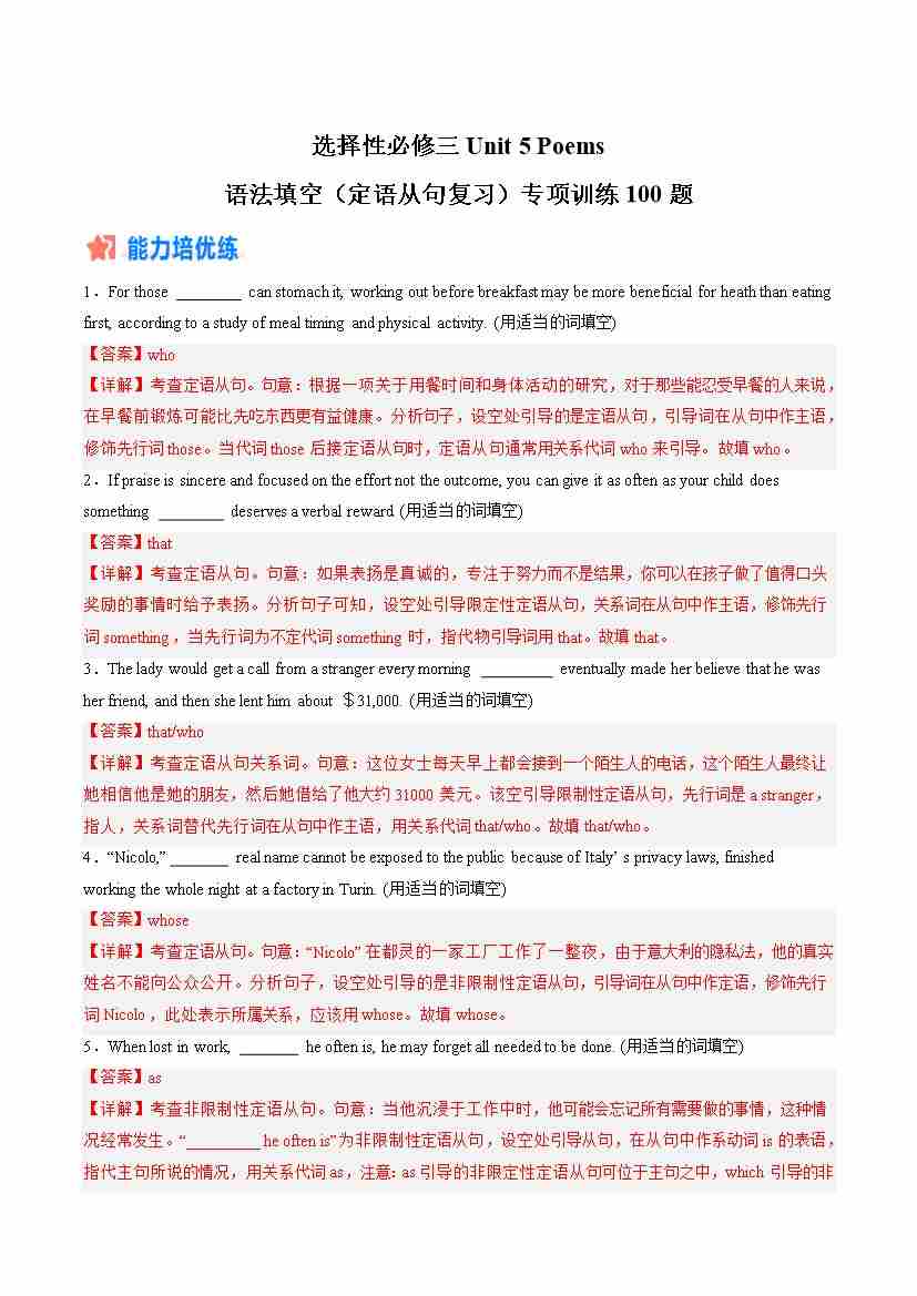 Unit 5 Poems:语法填空(定语从句复习)专项训练100题(教师版)-(人教版选择性必修第三册)