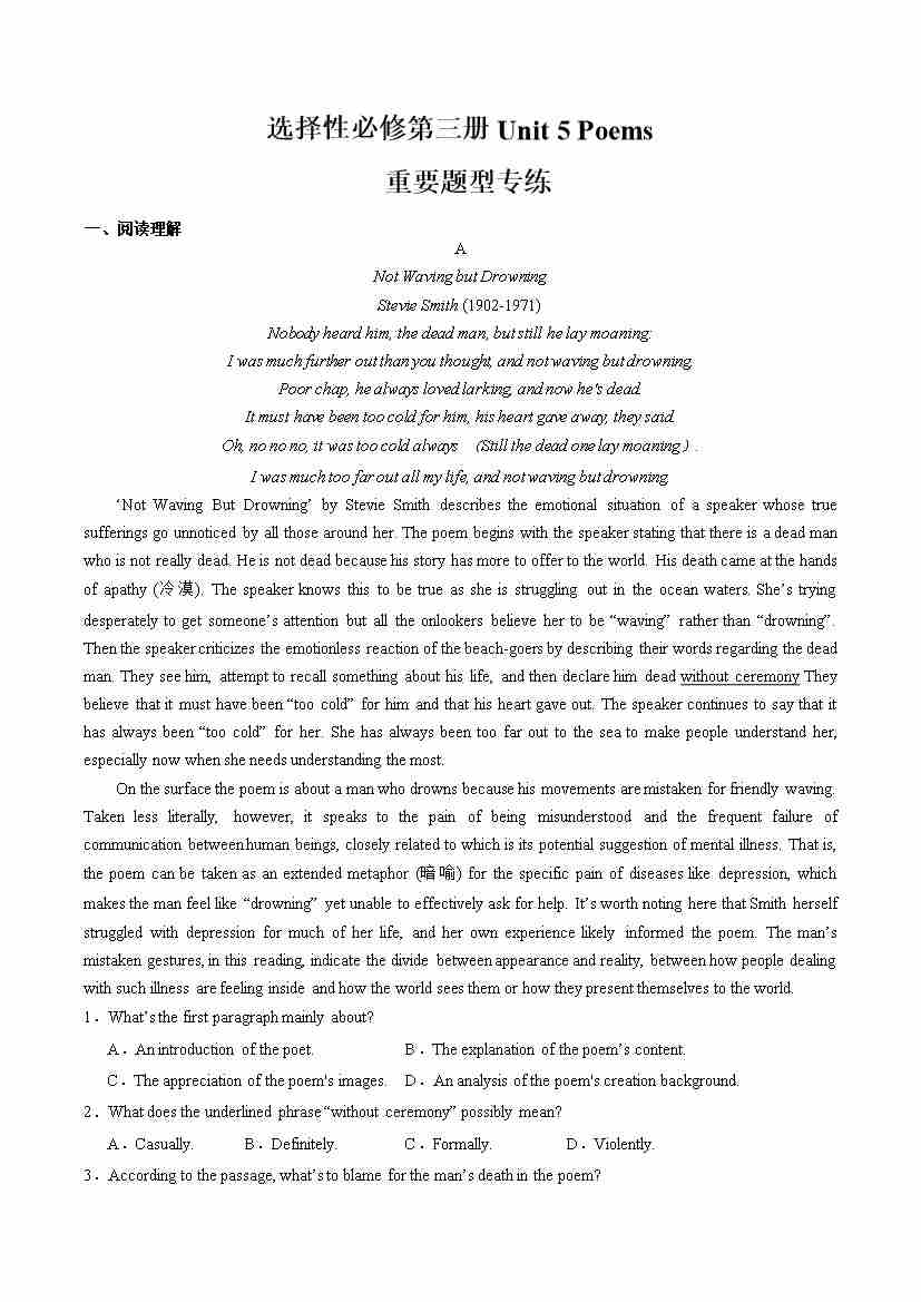 Unit 5 Poems:重要题型专练(教师版)-(人教版选择性必修第三册)