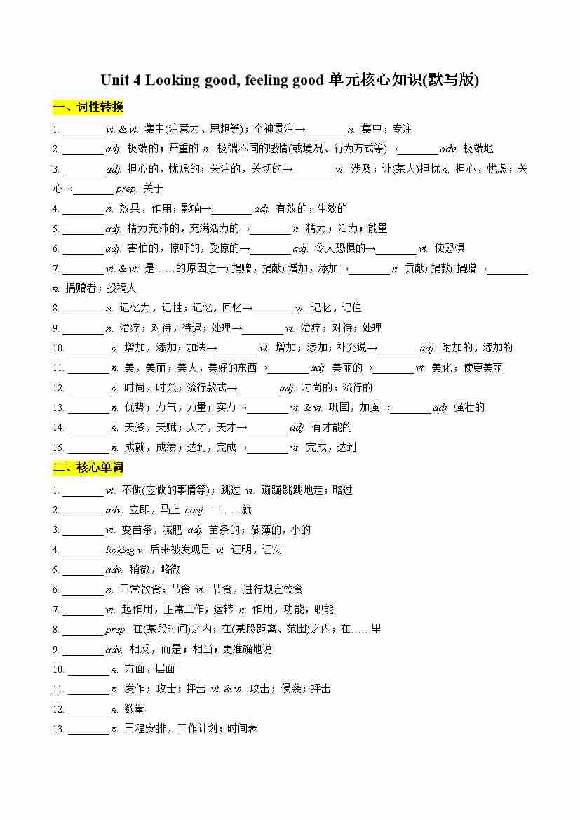 Unit 4 Looking good, feeling good(单元核心知识)(默写版)
