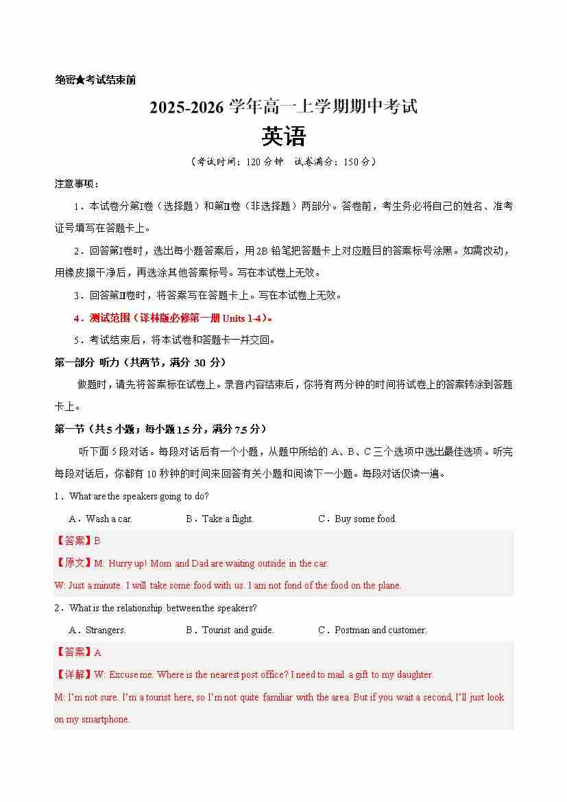 高一英语上学期期中模拟卷(江苏专用)(测试范围:译林版必修第一册)(教师版)