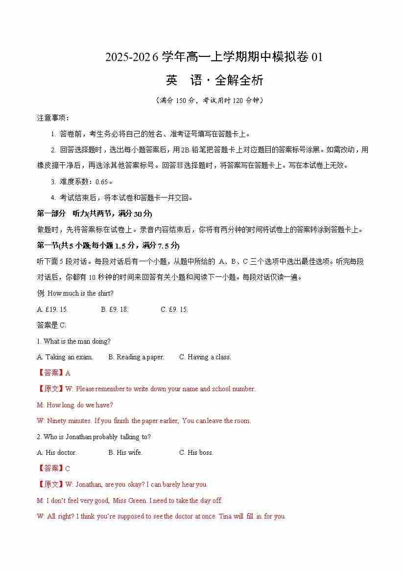 高一英语上学期期中模拟卷01(译林版)(教师版)