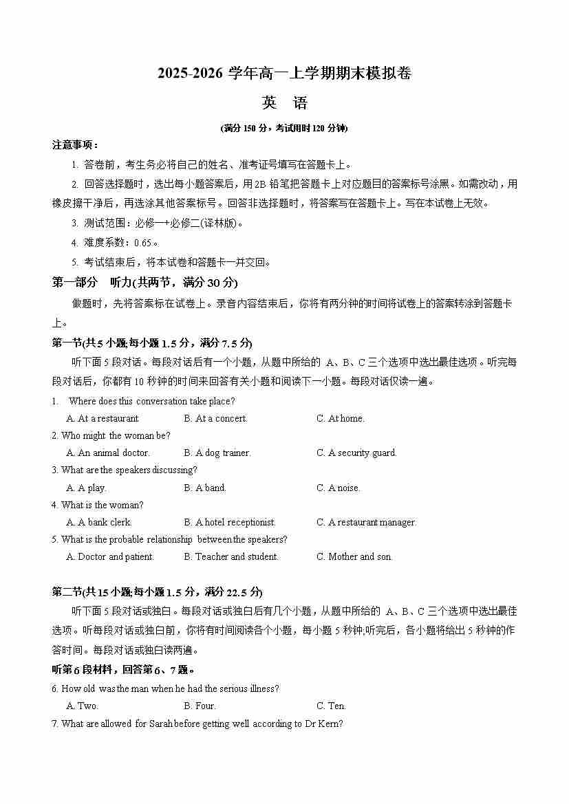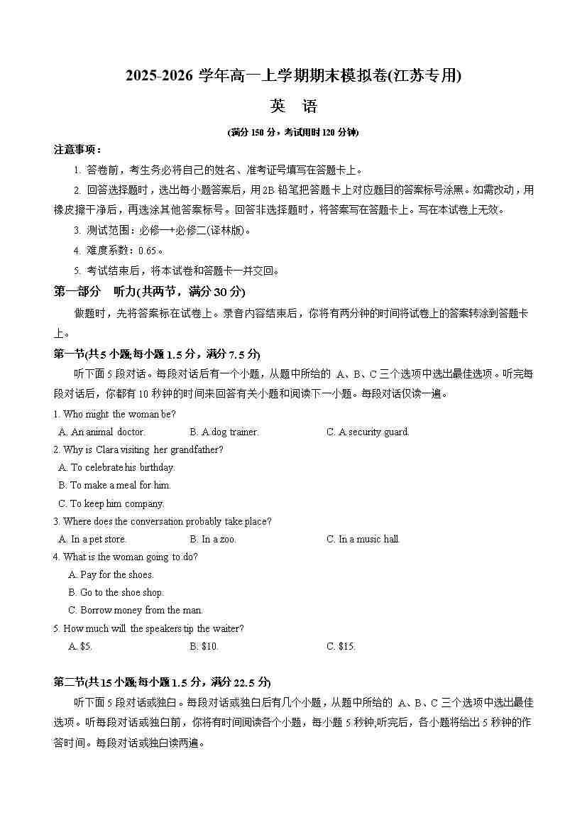 高一英语上学期期末模拟卷(江苏专用)(考试版A4)