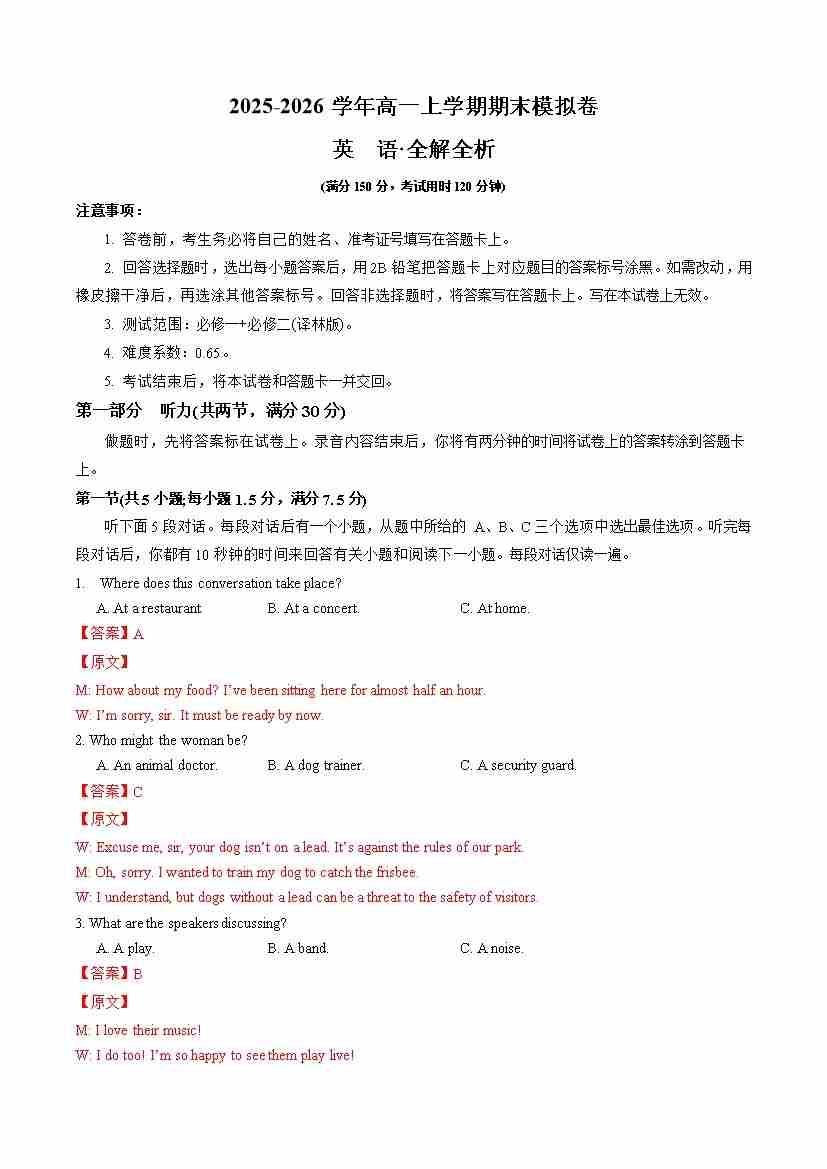 高一英语上学期期末模拟卷(江苏专用)(解析版)