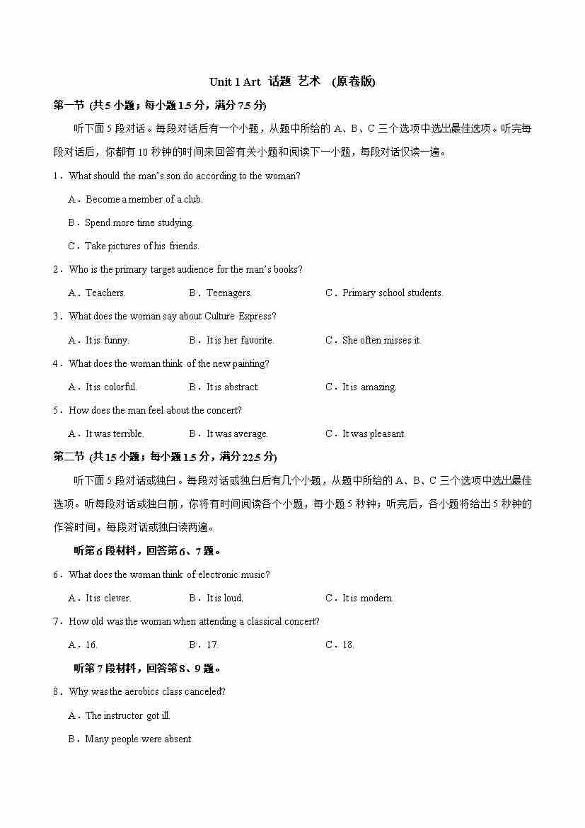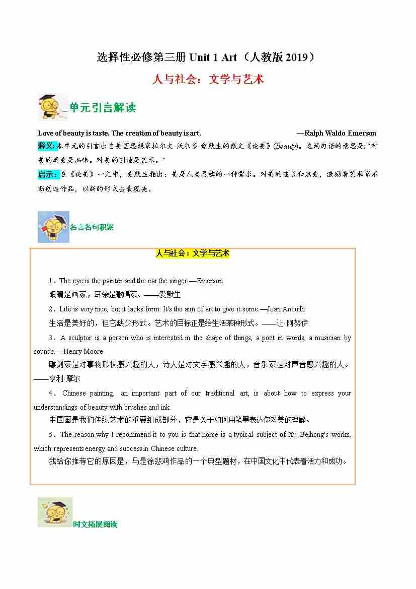 Unit 1 Art (人与社会:文学与艺术)(同步拓展阅读)(教师版)(人教版2019选择性必修三)