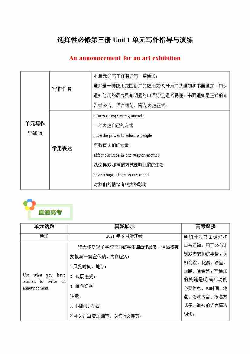 Unit 1 Art -高二英语单元写作深度指导(人教版2019选择性必修第三册)