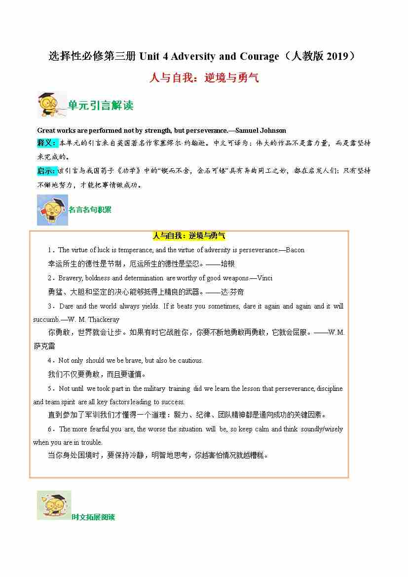 Unit 4 Adversity and Courage (人与自我:逆境与勇气)(同步拓展阅读)(教师版)(人教版2019选择性必修三)