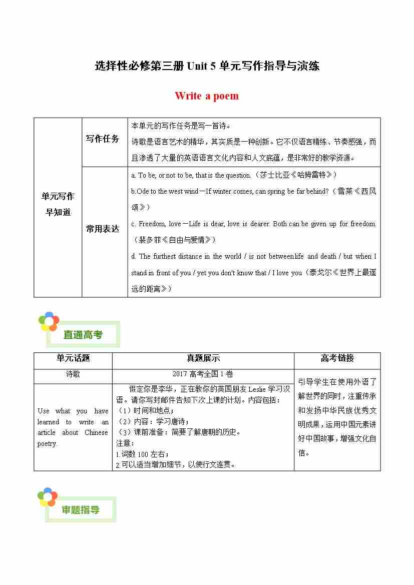 Unit 5 Poems-高二英语单元写作深度指导(人教版2019选择性必修第三册)