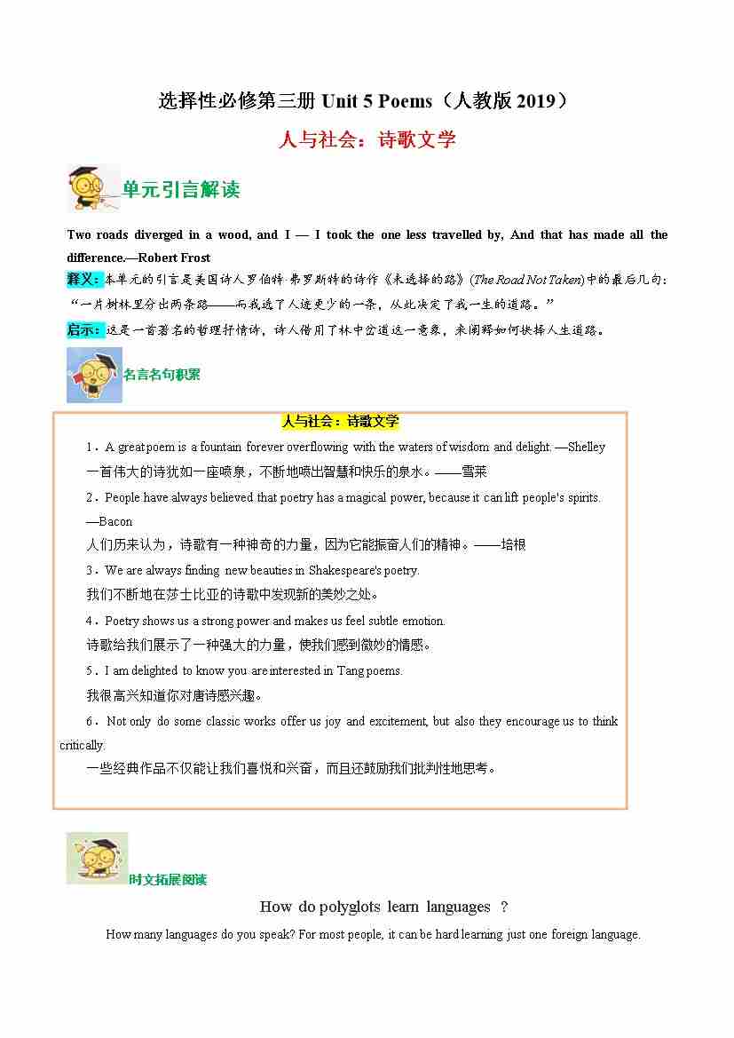 Unit 5 Poems (人与社会:诗歌文学)(同步拓展阅读)(教师版)(人教版2019选择性必修三)