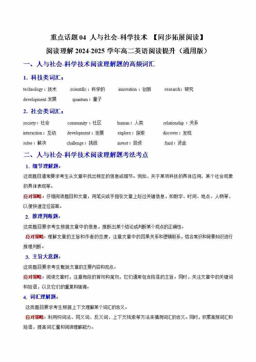 重点话题04 人与社会-科学技术 阅读理解 教师版(同步拓展阅读)(通用版)