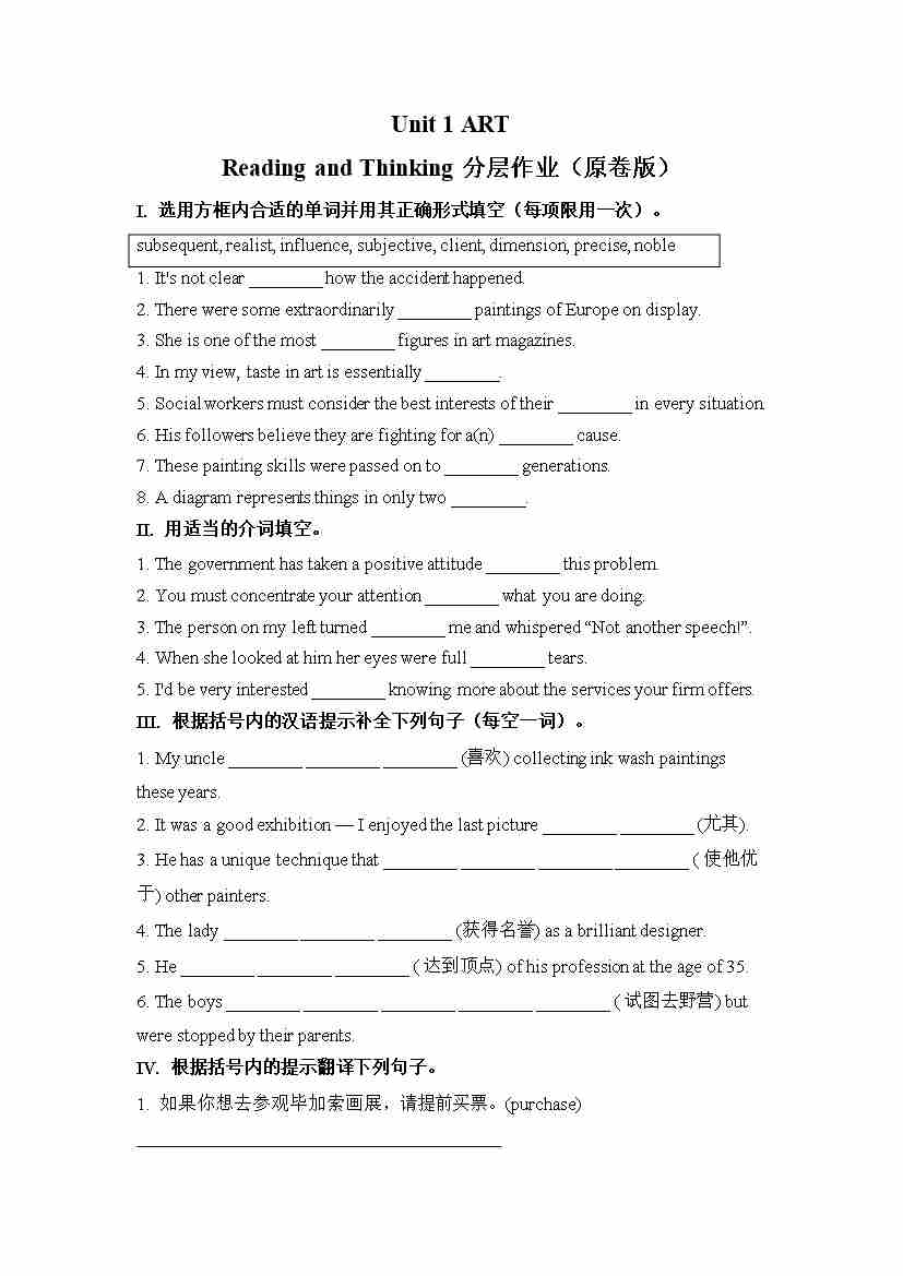 UNIT 1 ART Reading and Thinking分层作业(原卷版)