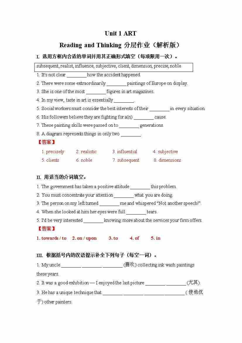 UNIT 1 ART Reading and Thinking分层作业(解析版)