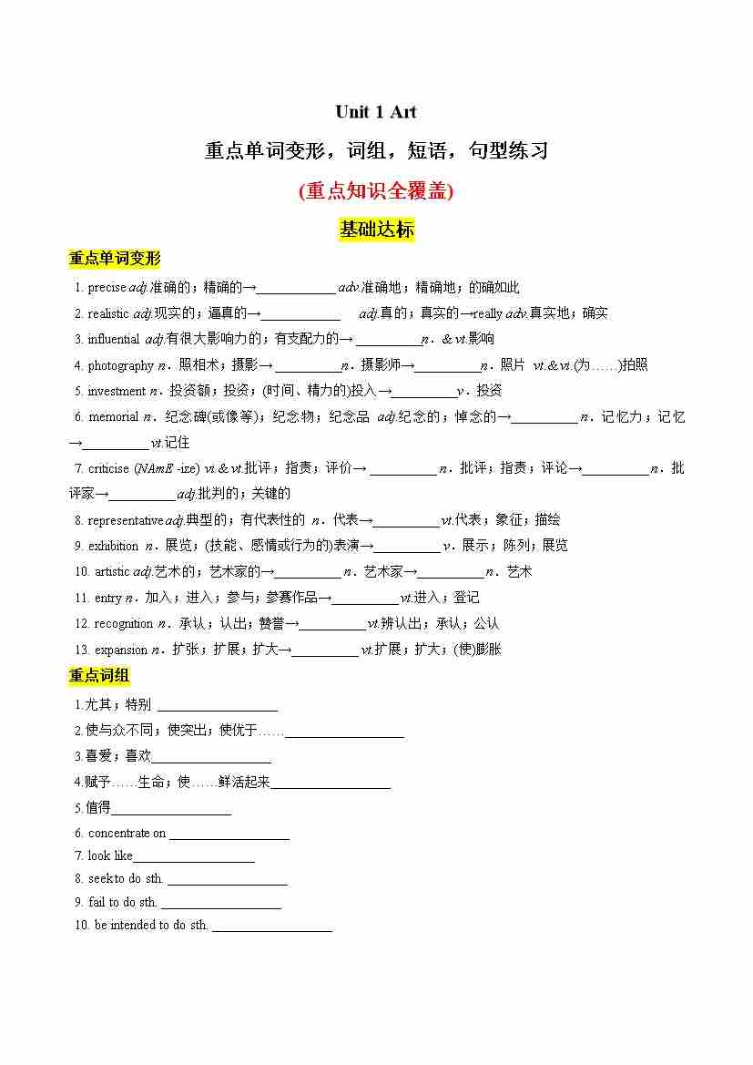 Unit 1 Art 单词,短语,句型,语法专练(分层作业)(原卷版)