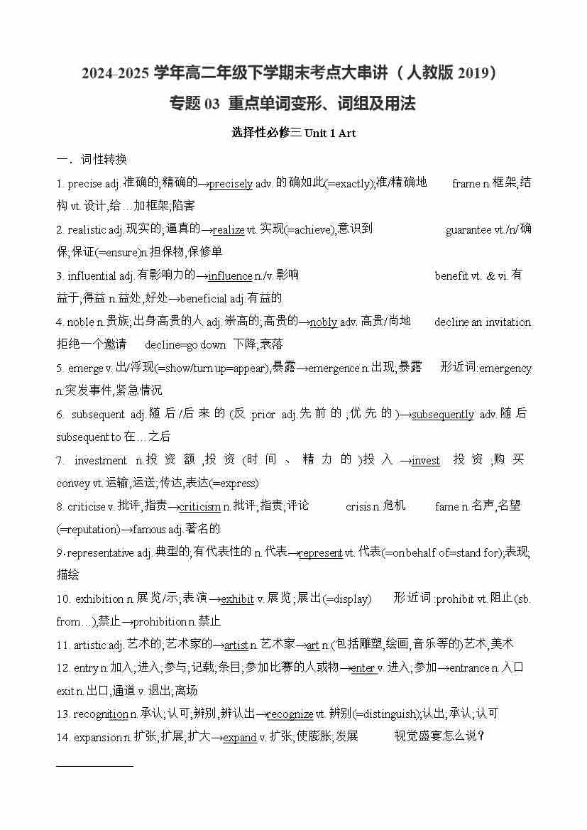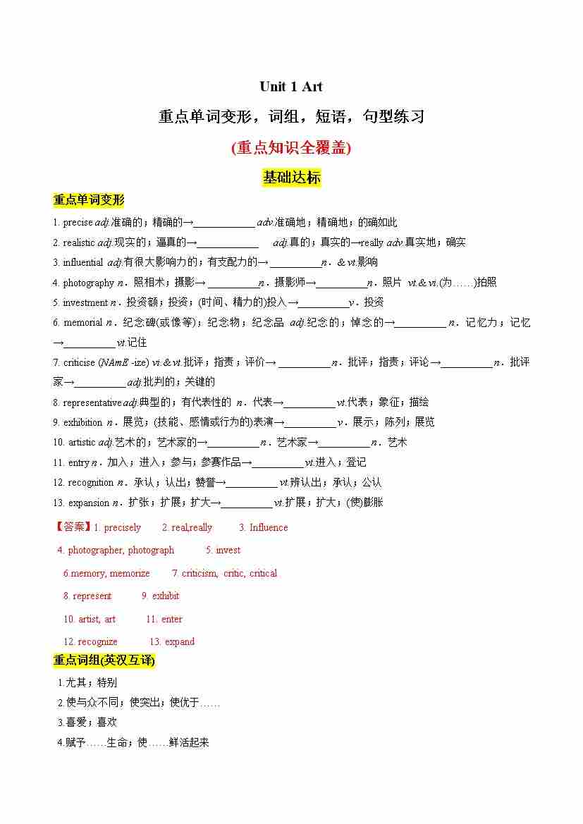 Unit 1 Art 单词,短语,句型,语法专练(分层作业)(解析版)