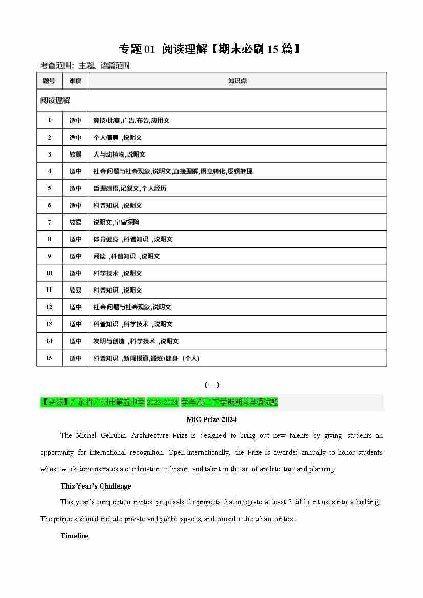 专题01 阅读理解(期末必刷15篇) - (人教版2019)(学生版)
