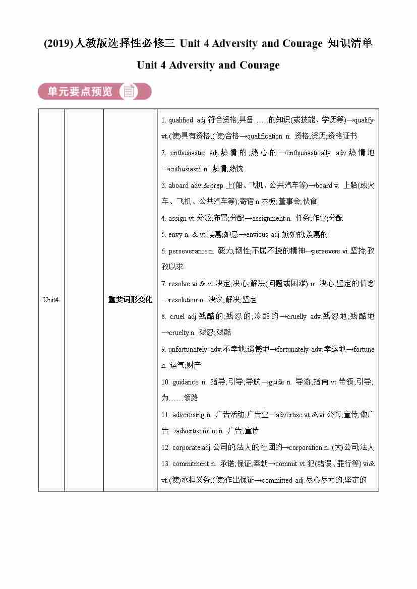 人教版选择性必修三 Unit 4 Adversity and Courage 知识清单(学生版)