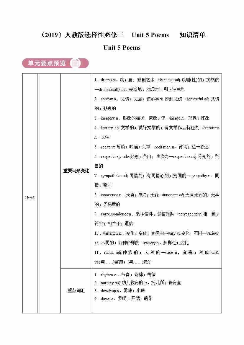 人教版选择性必修三 Unit 5 Poems 知识清单(学生版)