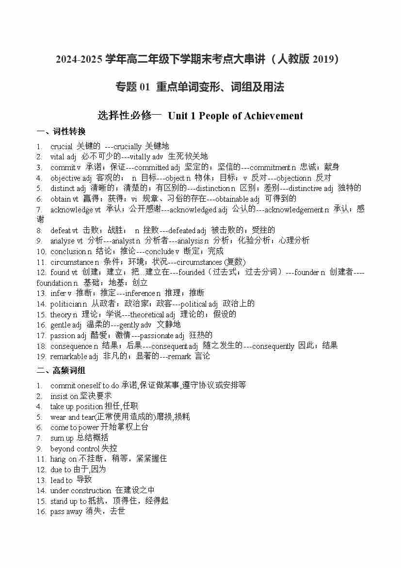 考点清单01 选必一Unit1~Unit 5 (重点单词变形、词组、句型和范文)- (人教版2019)