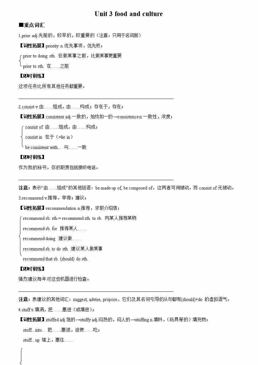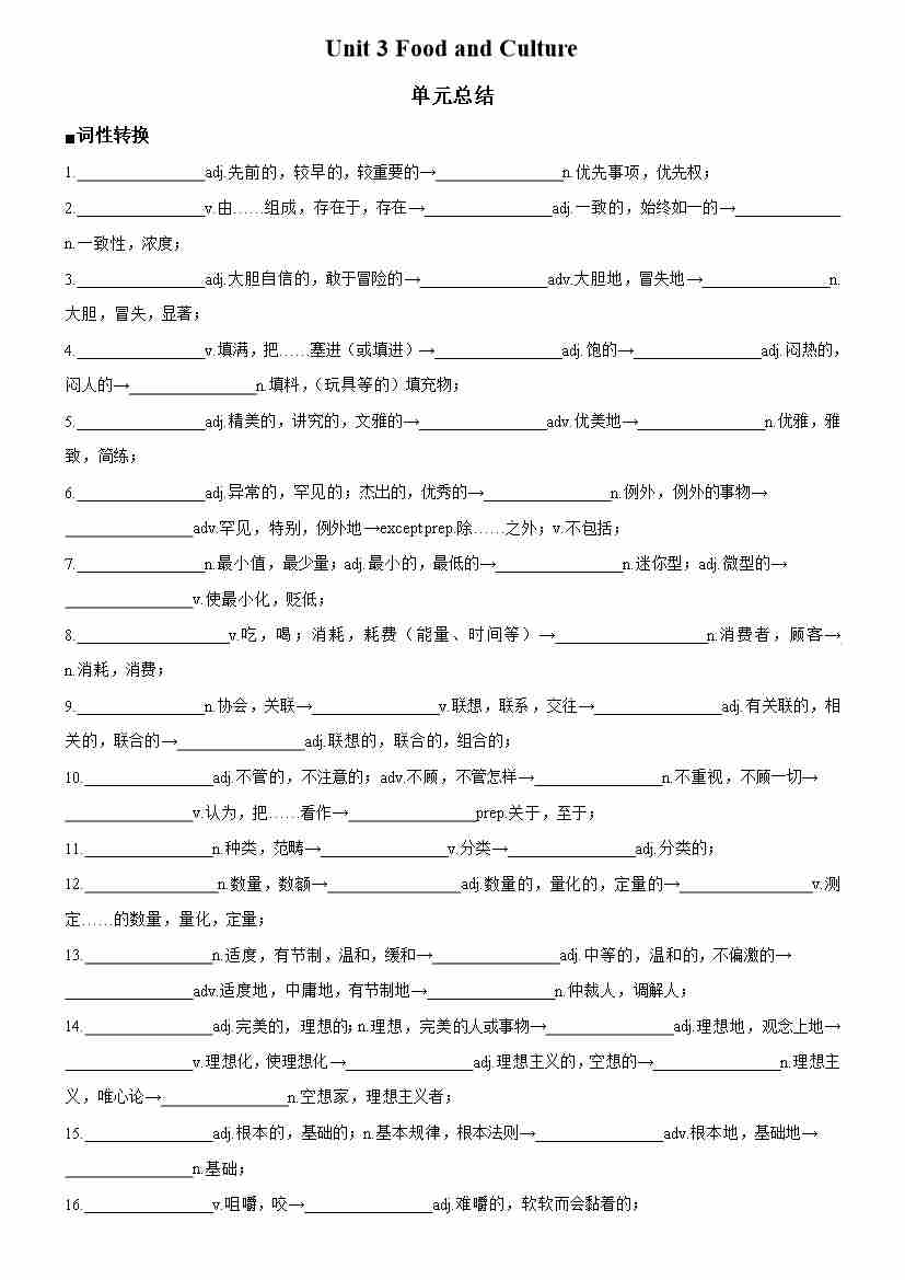Unit 3 Food and Culture词性转换、重点短语、同步习题(含答案)-(人教版选择性必修第二册)