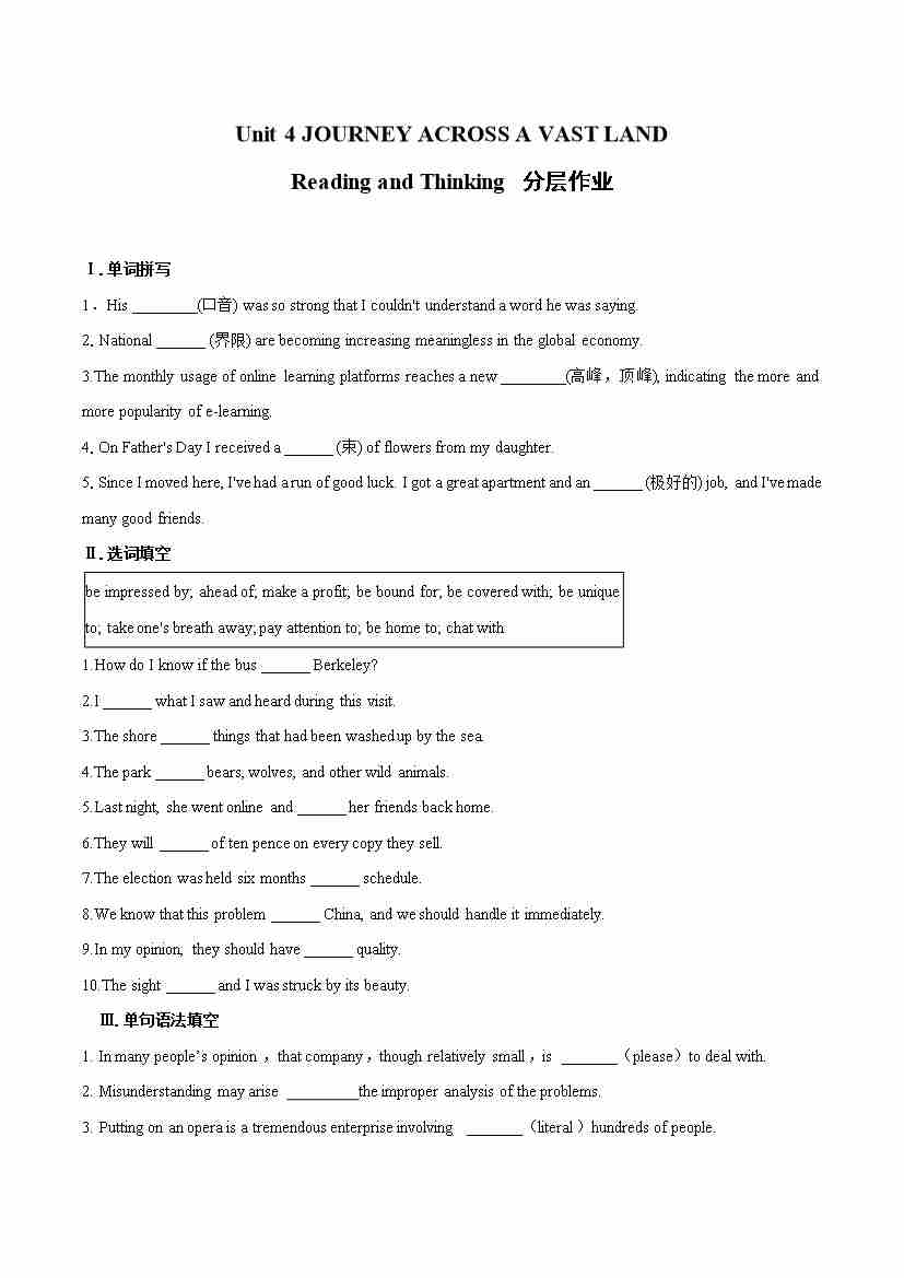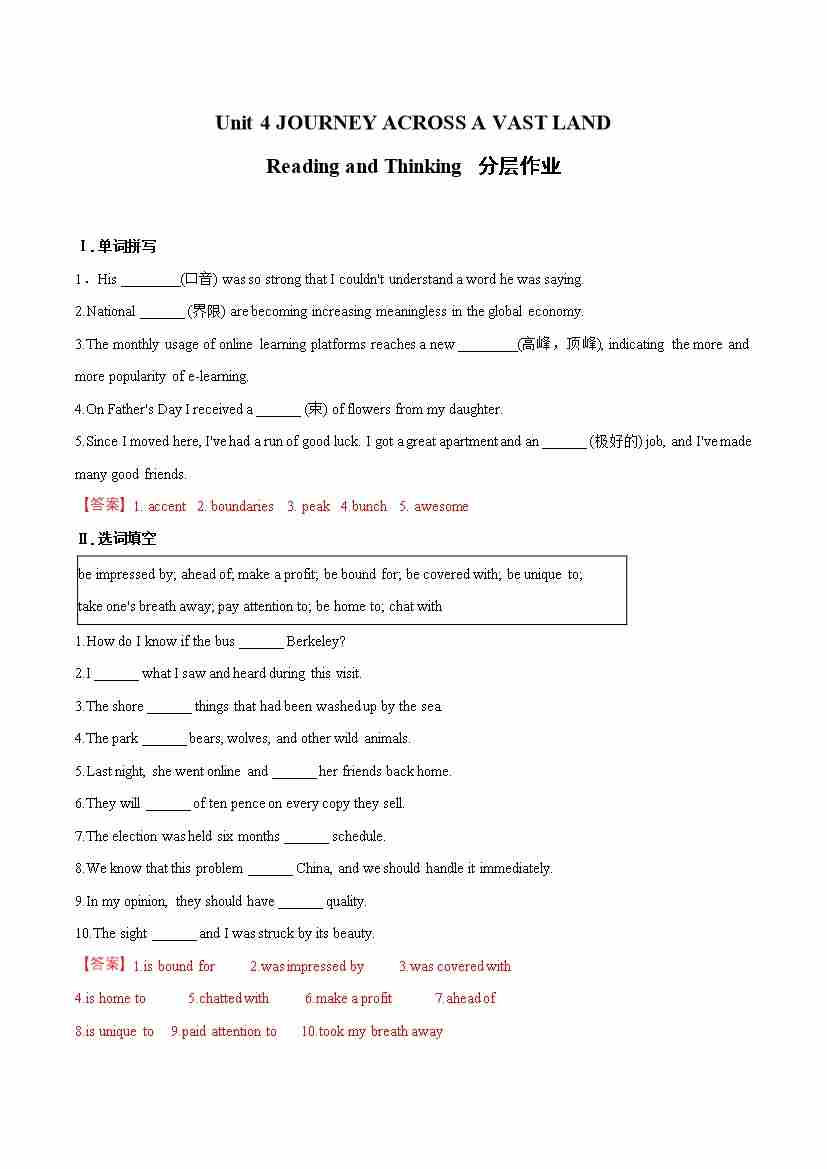 Unit 4 JOURNEY ACROSS A VAST LAND Reading And Thinking(分层作业)(解析版)