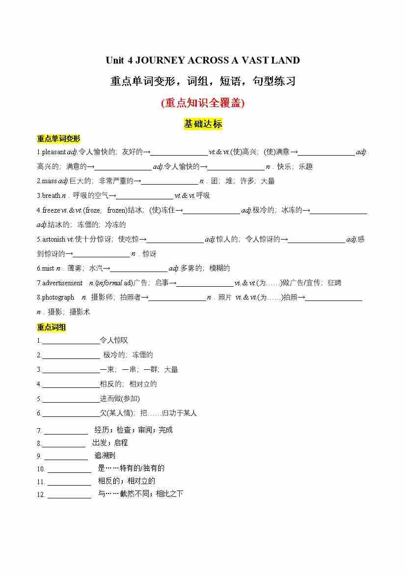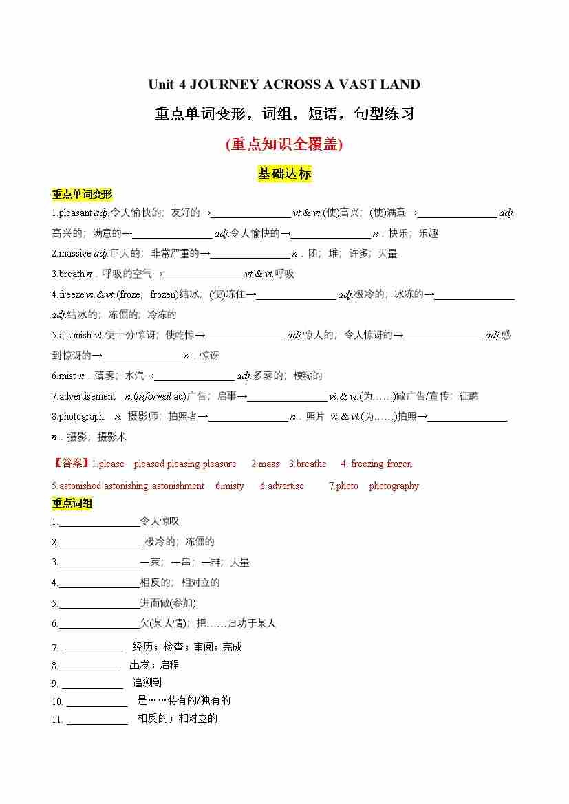 Unit 4 JOURNEY ACROSS A VAST LAND 单词,短语,句型,语法专练(分层作业)(解析版)