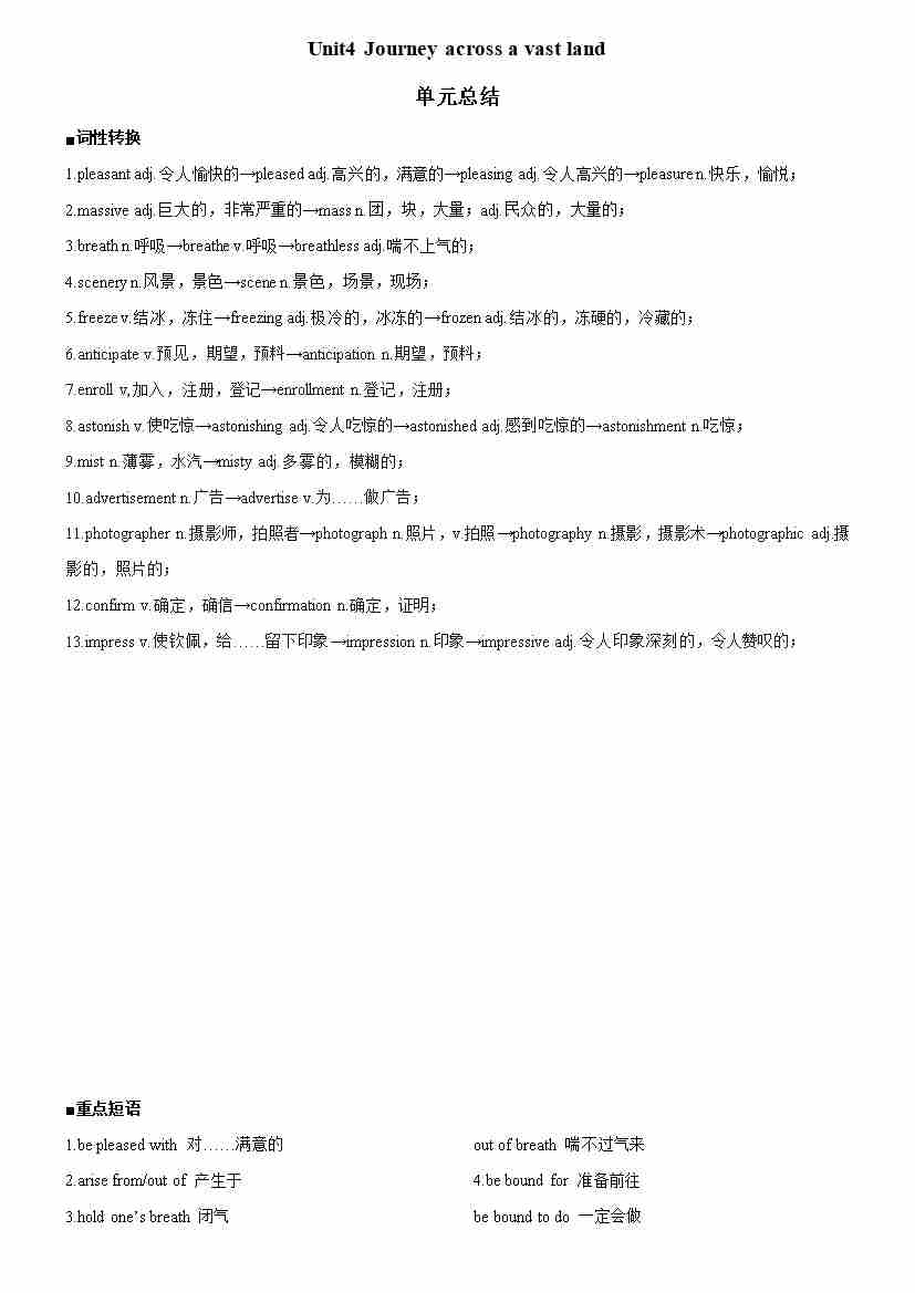 Unit 4 Journey across a vast land词性转换、重点短语、同步习题(含答案)-(人教版选择性必修第二册)