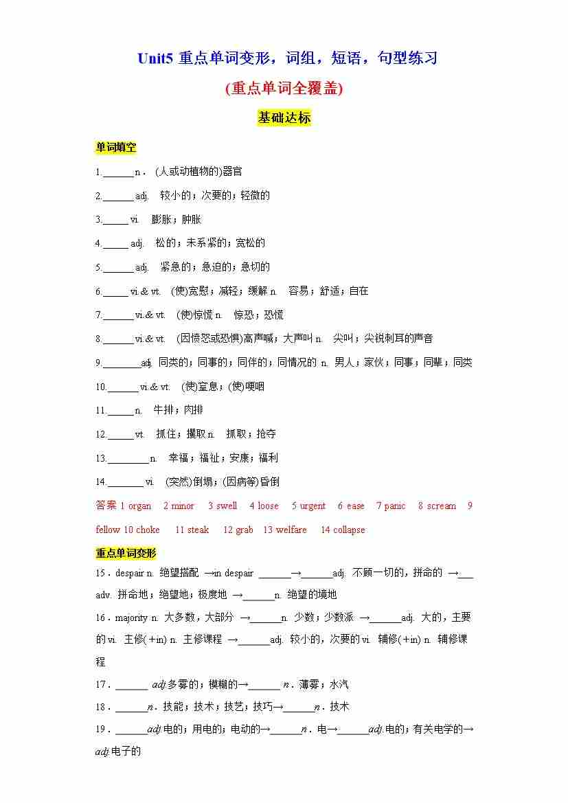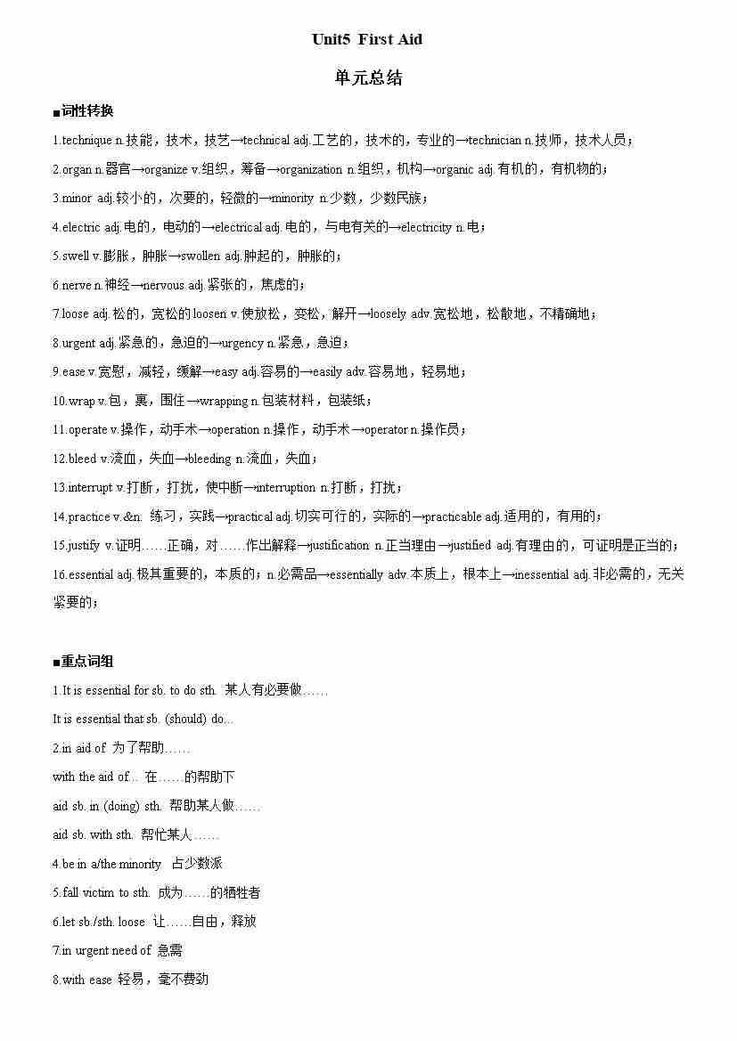 Unit 5 First Aid 词性转换、重点短语、同步习题(含答案)-(人教版选择性必修第二册)