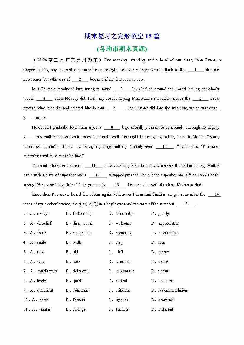 期末复习之完形填空15篇(各地市期末真题)(教师版)