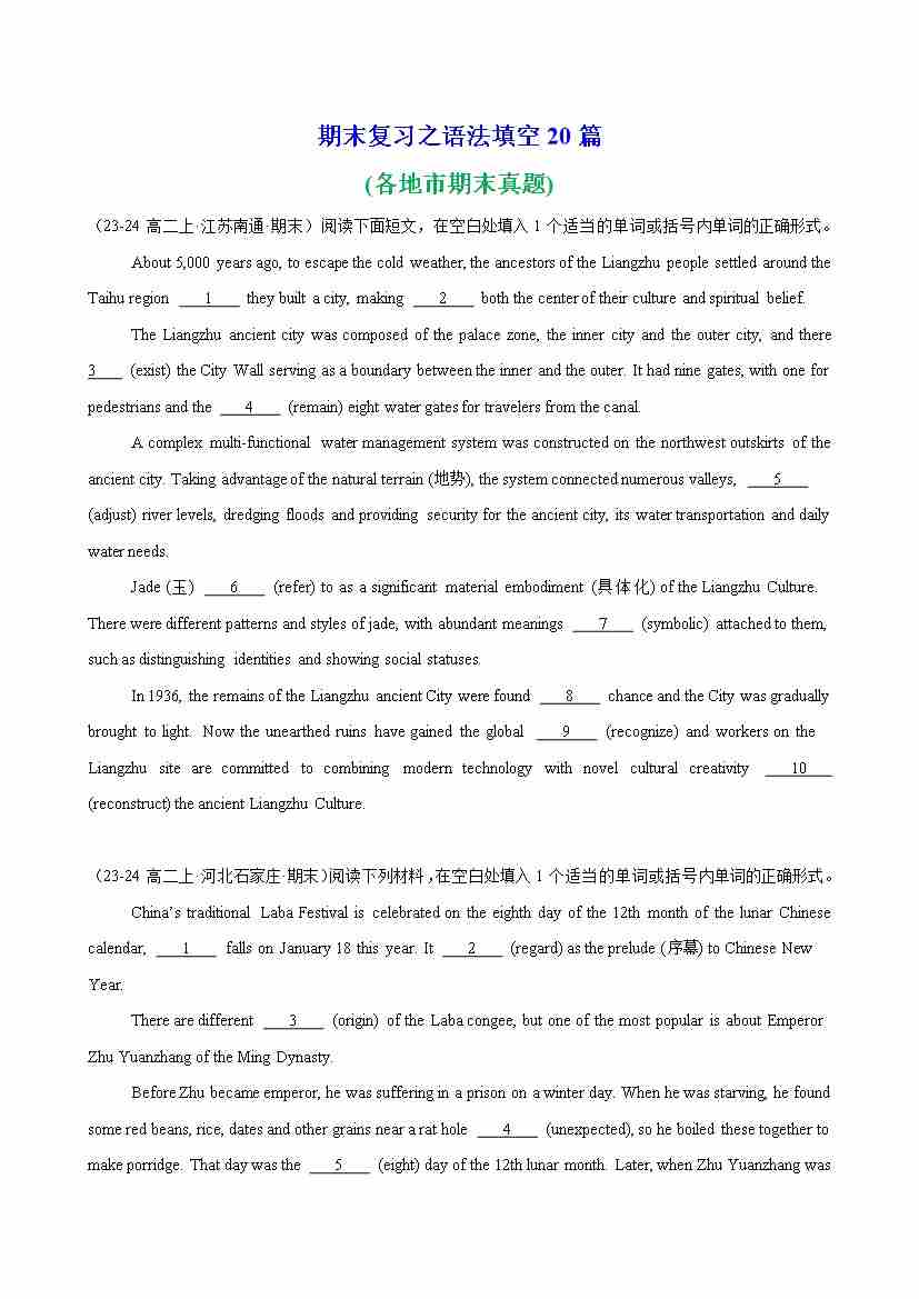 期末复习之语法填空20篇(各地市期末真题)(学生版)