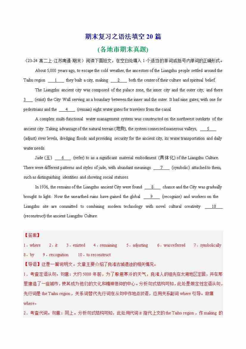 期末复习之语法填空20篇(各地市期末真题)(教师版)