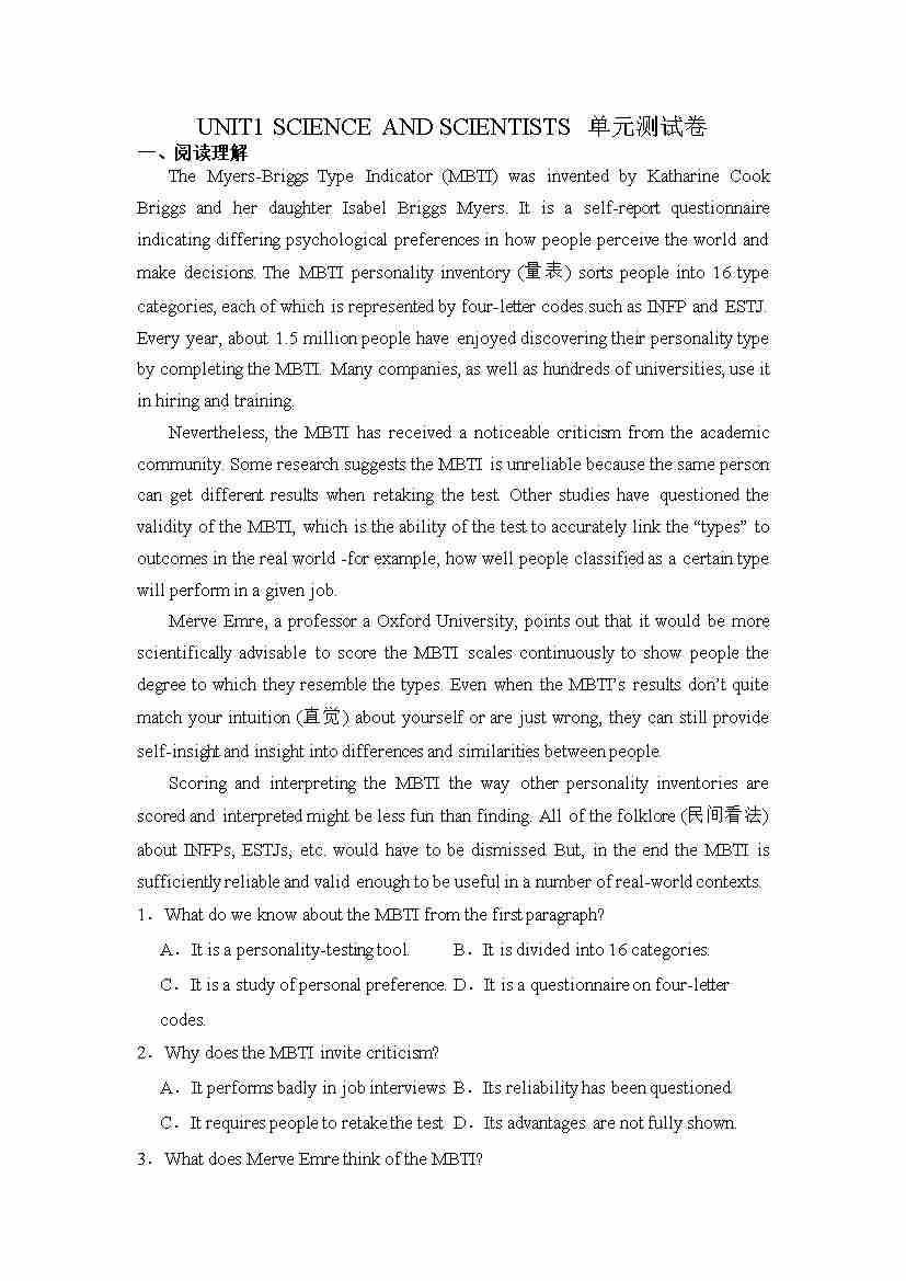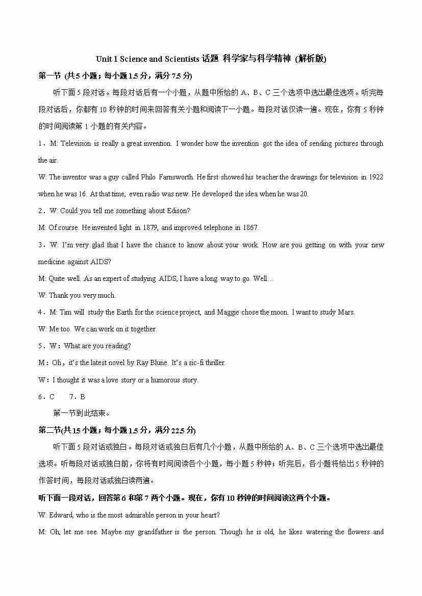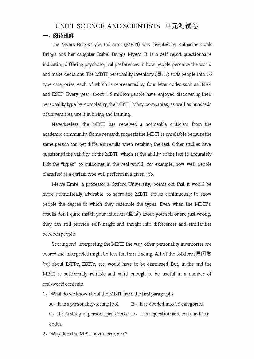 UNIT1 SCIENCE AND SCIENTISTS(单元检测卷)解析版-