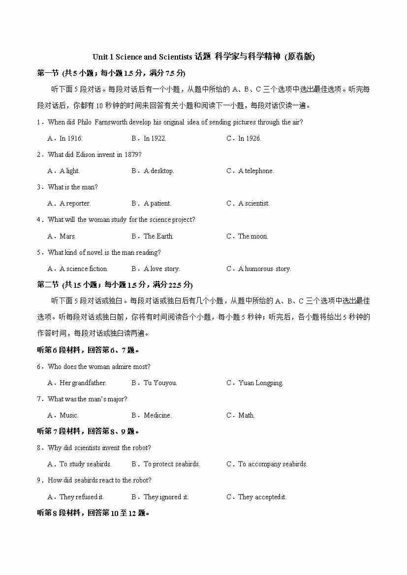 UNIT1 SCIENCE AND SCIENTISTS(单元检测卷)原卷版-
