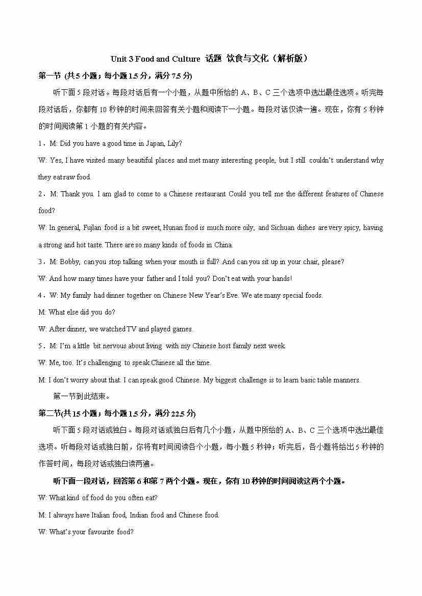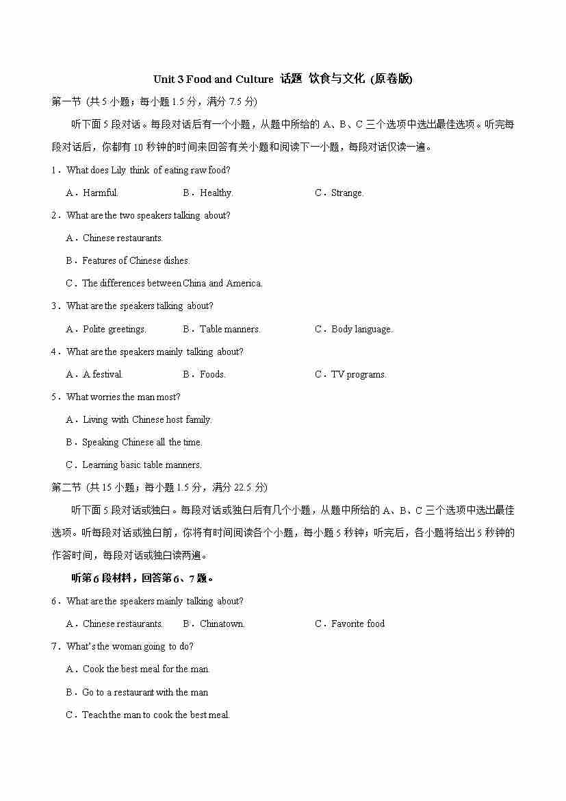 Unit 3 Food and Culture 话题 饮食与文化(教师版)