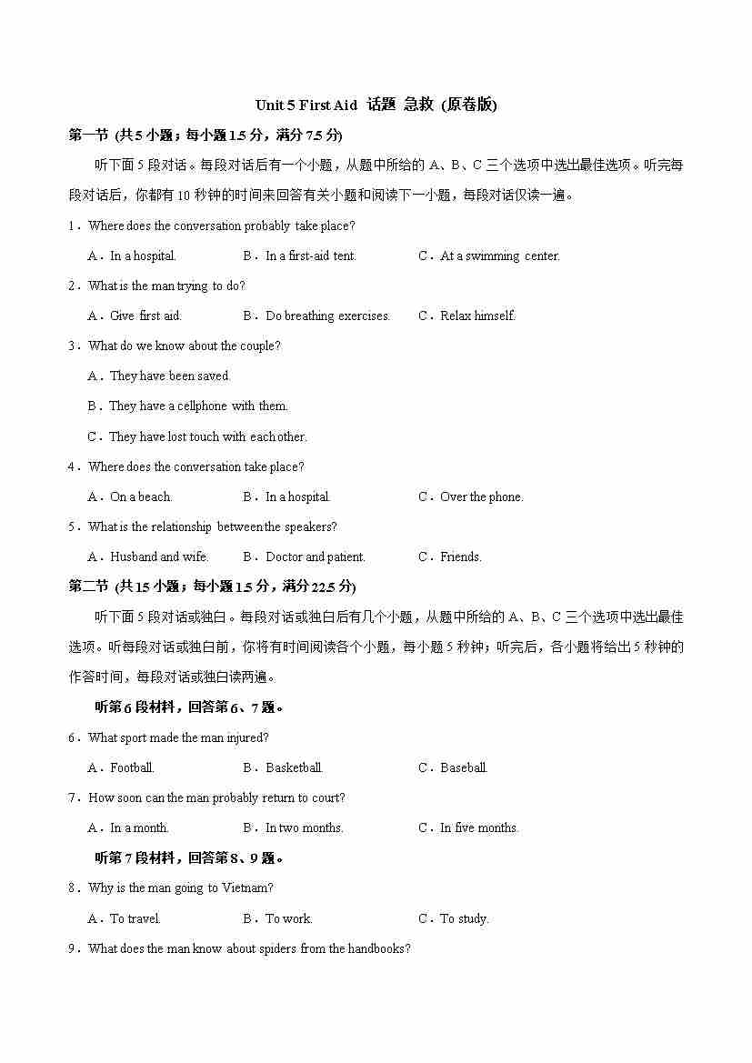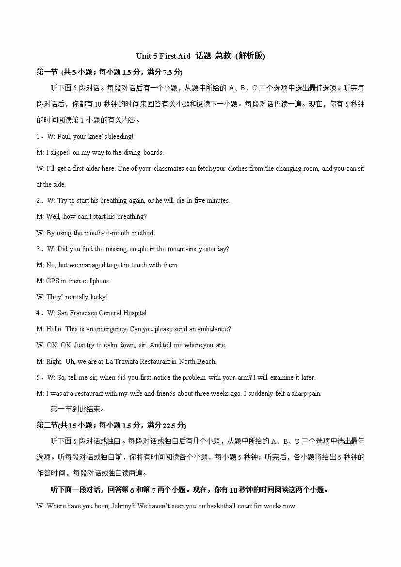 高中人教英语选修二Unit 1-Unit 5 First Aid(单元测试·提升卷)(听力)
