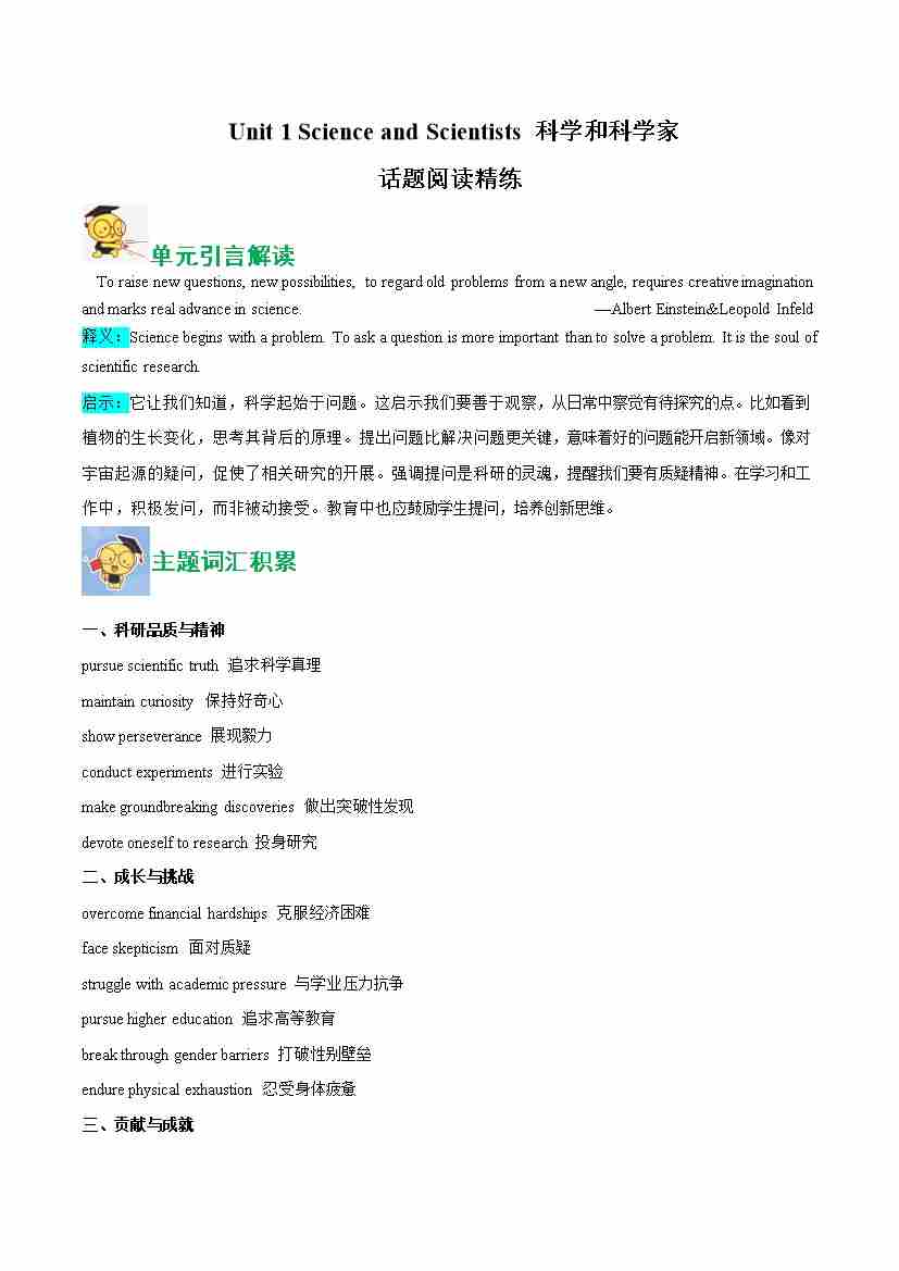 Unit 1 Science and Scientists 科学和科学家(话题阅读精练)(教师版)
