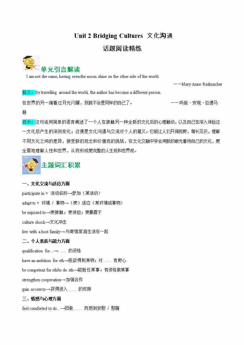 Unit 2 Bridging Cultures 文化沟通(话题阅读精练)(教师版)