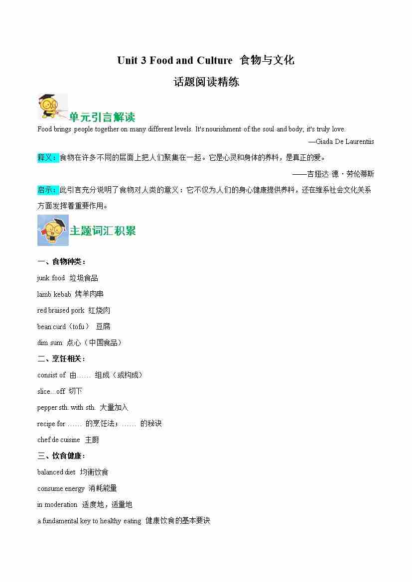 Unit 3 Food and Culture 食物与文化(话题阅读精练)(学生版)