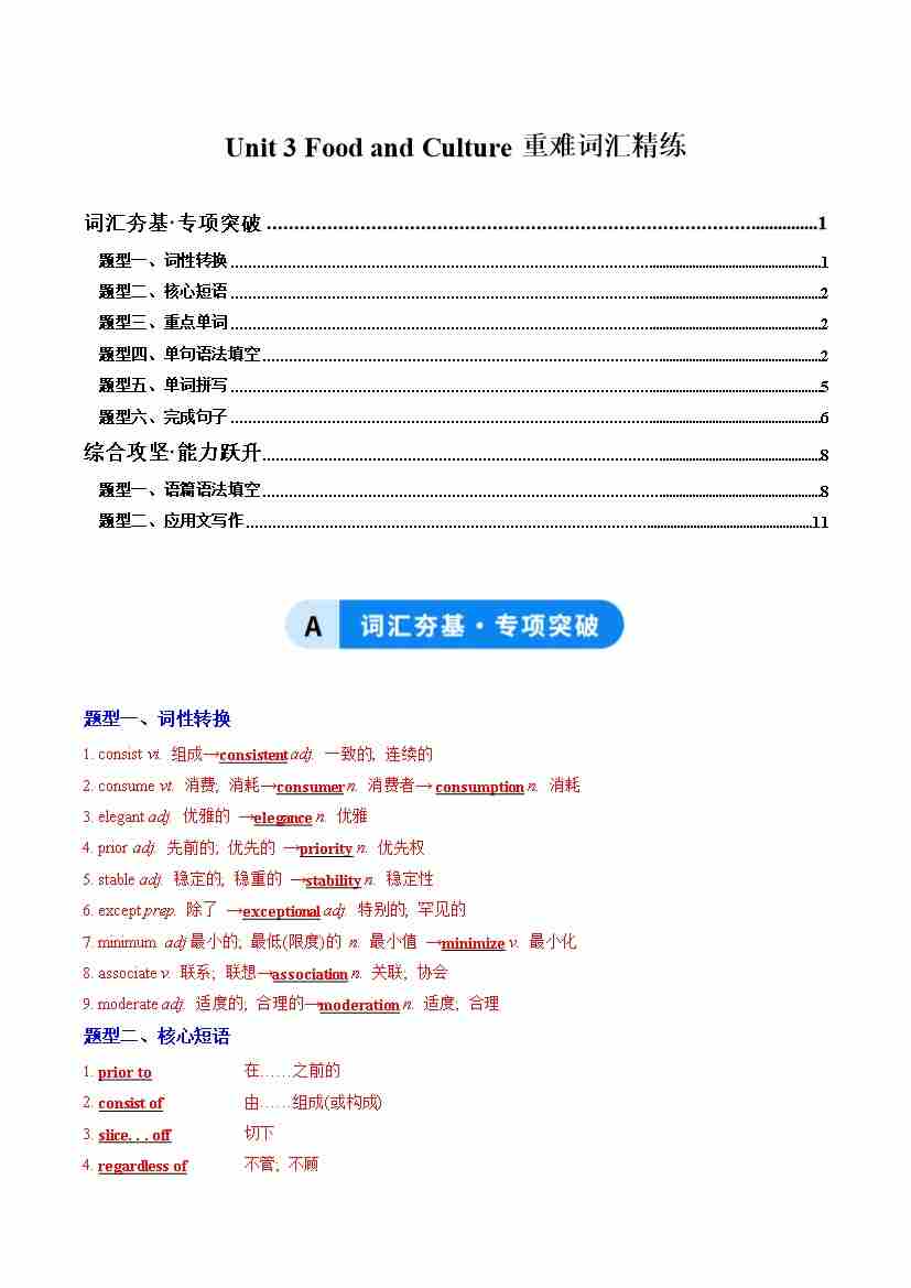 Unit 3 Food and Culture(重难词汇精练)(教师版)
