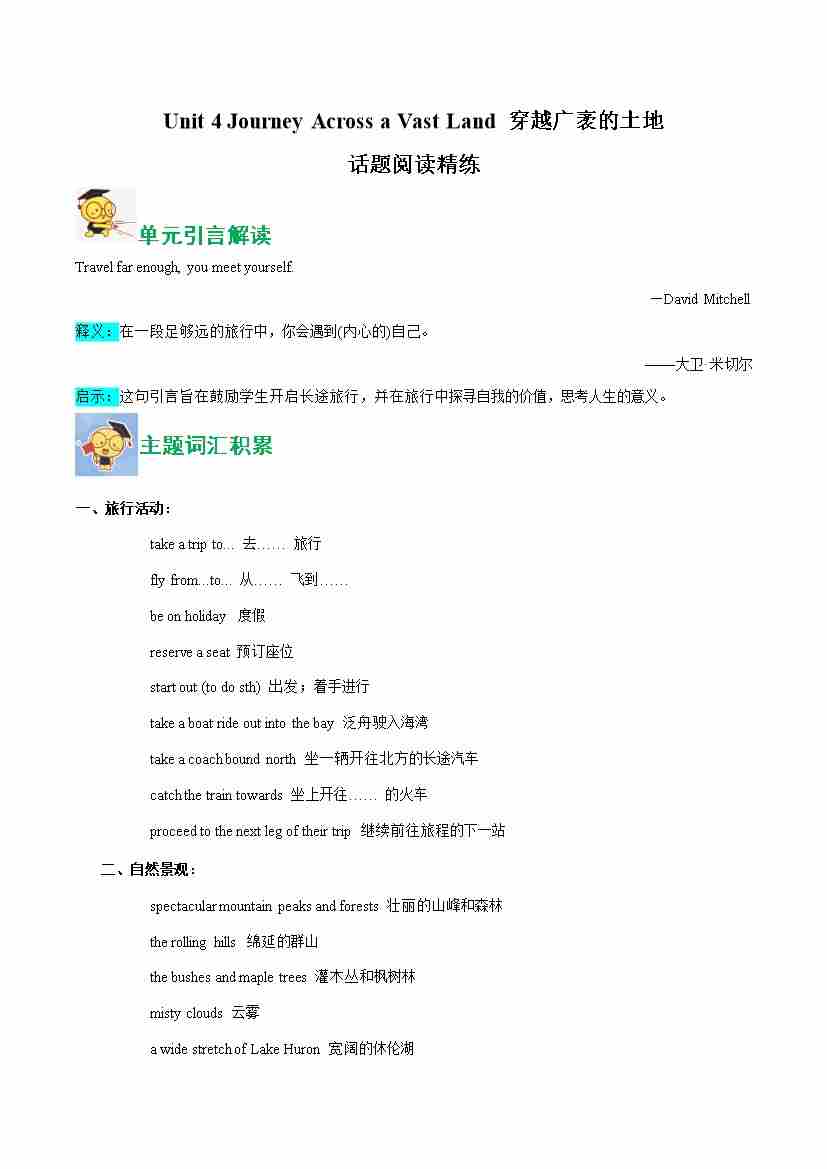 Unit 4 Journey Across a Vast Land 穿越广袤的土地(话题阅读精练)(教师版)