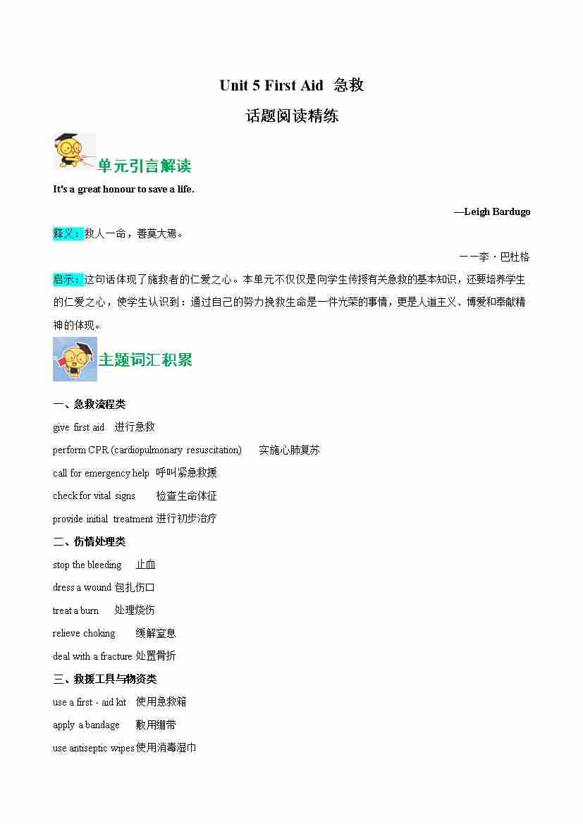 Unit 5 First Aid 急救(话题阅读精练)(教师版)