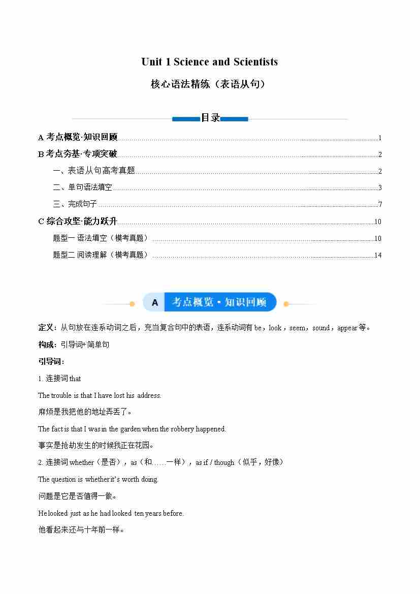 Unit 1 Science and Scientists 表语从句(单元核心语法精练)(教师版)