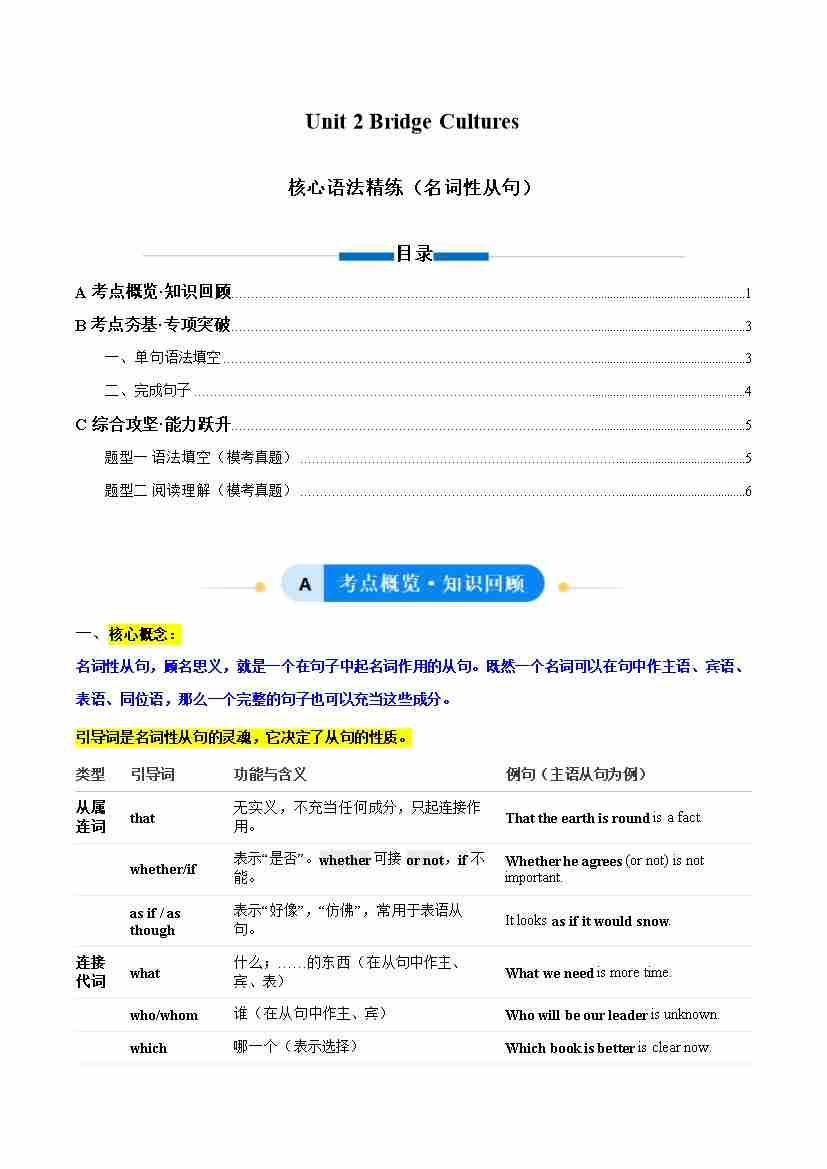 Unit 2 Bridge Cultures 名词性从句(单元核心语法精练)(学生版)
