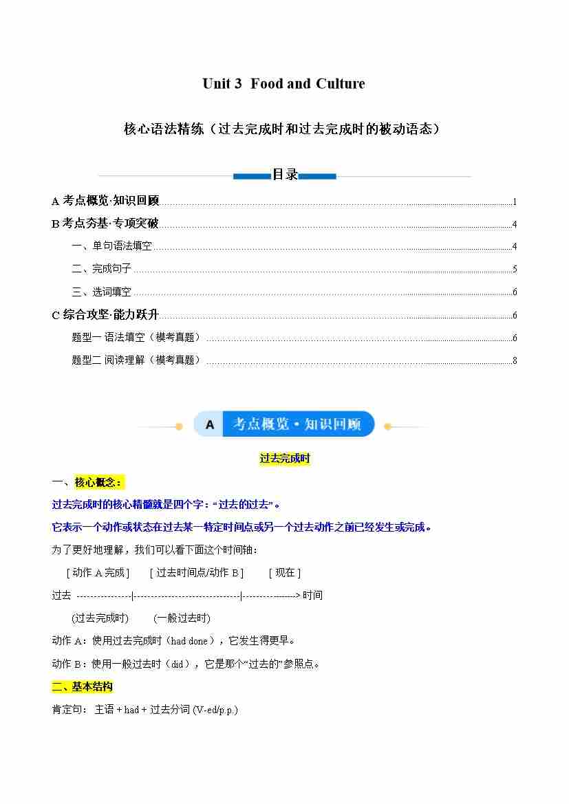 Unit 3 Food and Culture 过去完成时及其被动语态(单元核心语法精练)(学生版)