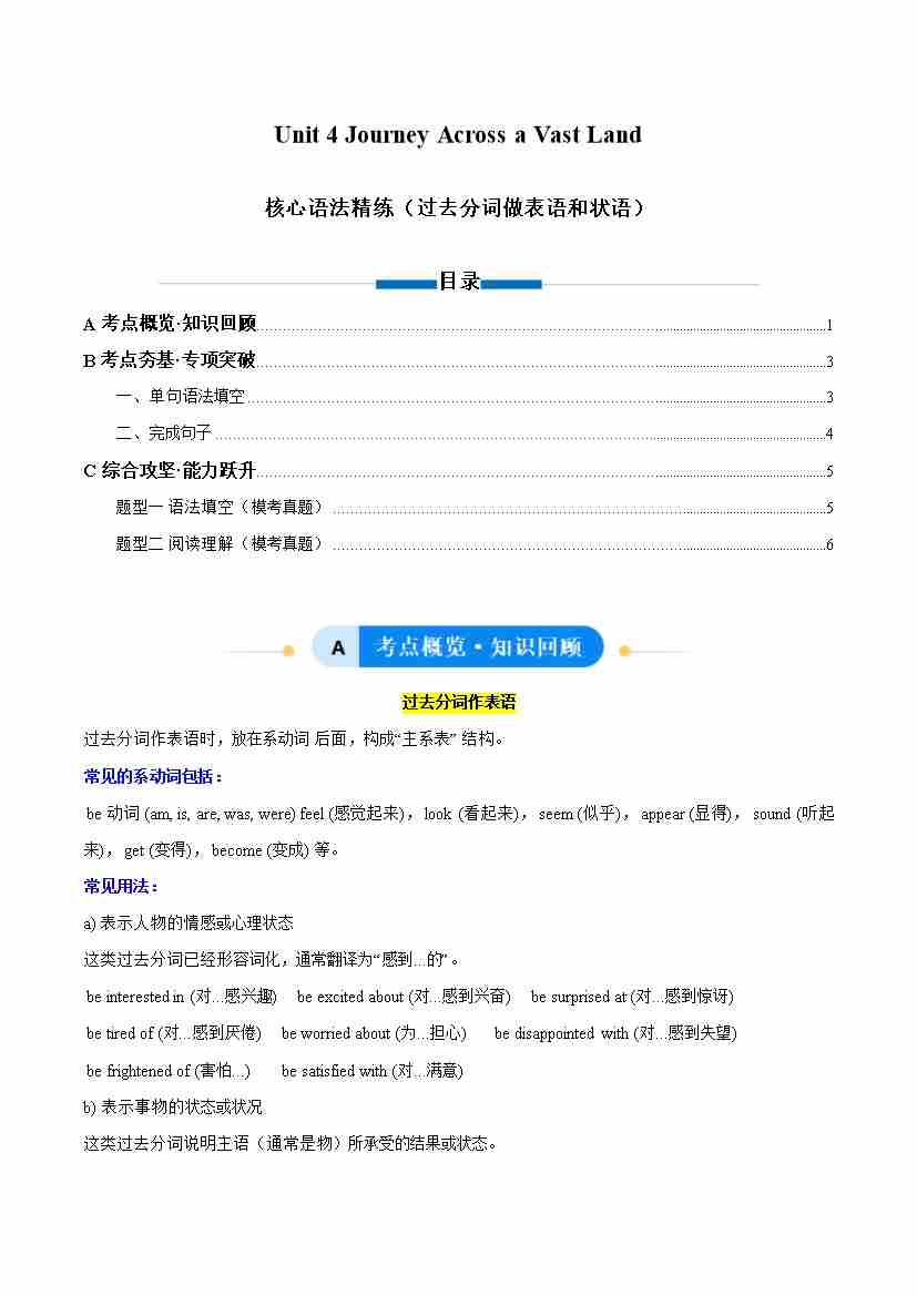 Unit 4 Journey Across a Vast Land 过去分词做表语和状语(单元核心语法精练)(学生版)