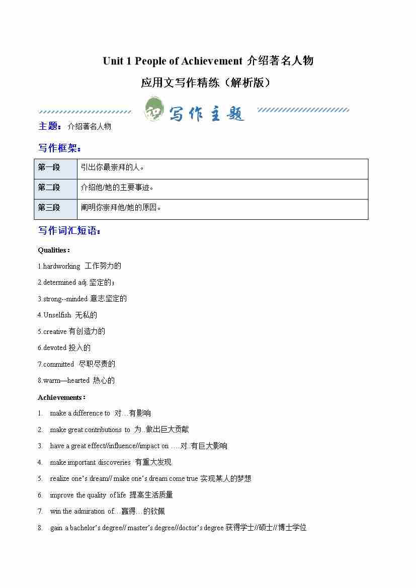 Unit 1 People of Achievement 介绍著名人物(单元应用文写作精练)(教师版)